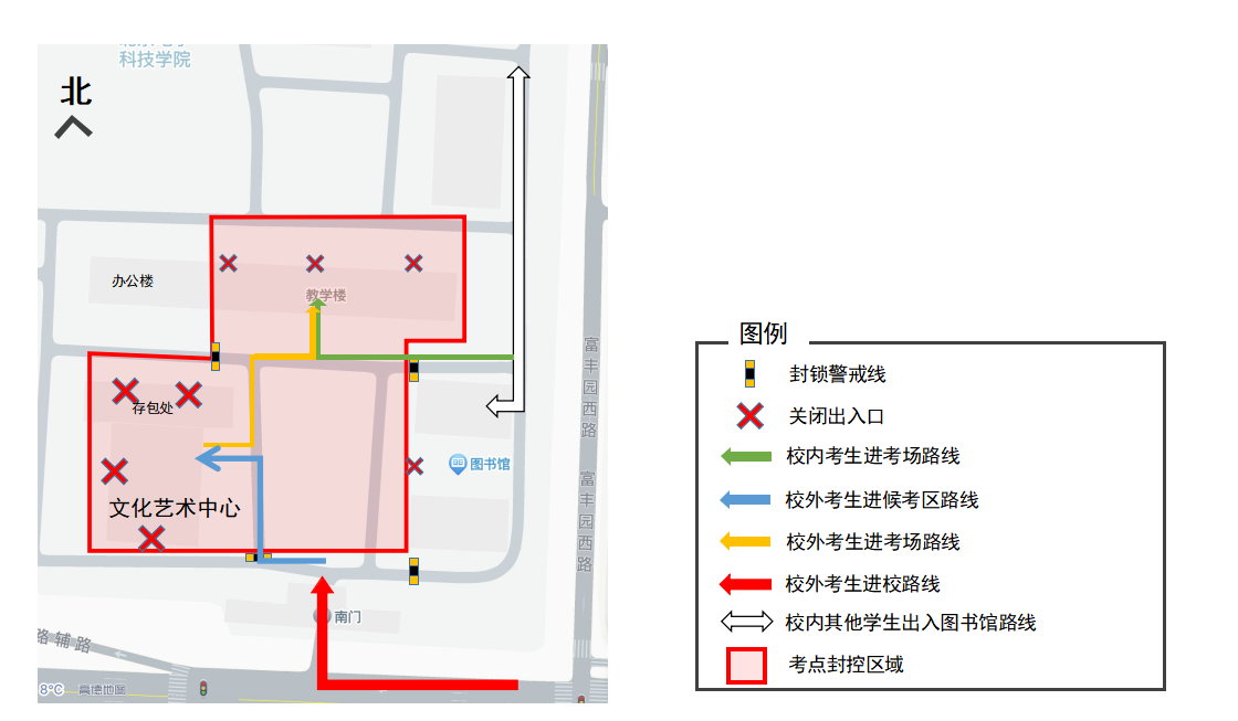 校外考生從學院南門進出,考試當天7:00、12:00開始允許考生本人進入。南門設置兩條核驗通道,由工作人員驗證考生準考證和身份證無誤后進入校園。校內考生從學院圖書館北側通道進入考場樓入口,工作人員核驗準考證和身份證無誤后方可通行。